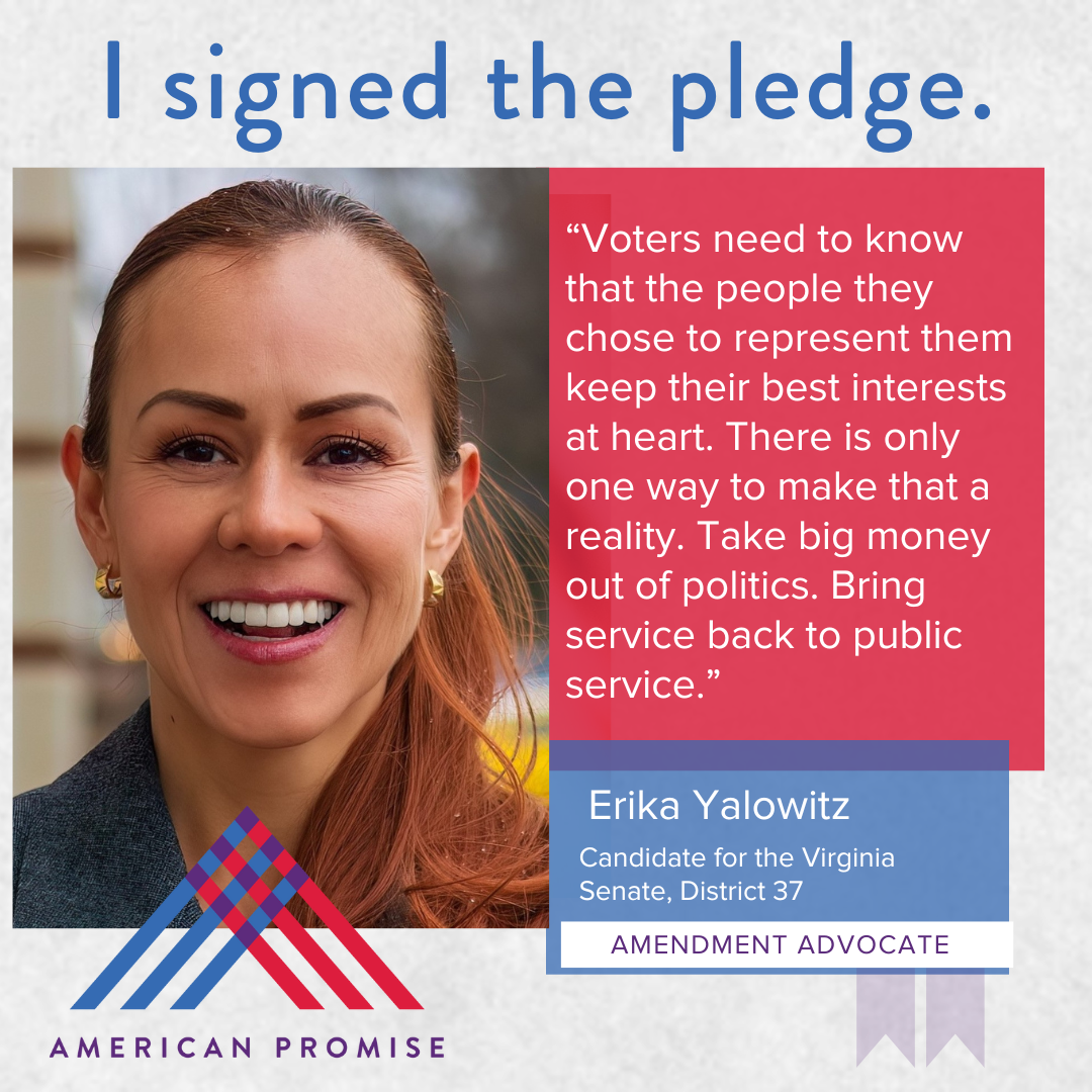 “I support getting big money out of politics by amending the United States Constitution to guard against corruption and protect liberty, federalism, and the equal rights of free speech by limiting the undue influence of money in elections and government. I additionally support comprehensive campaign finance reform in Virginia.”